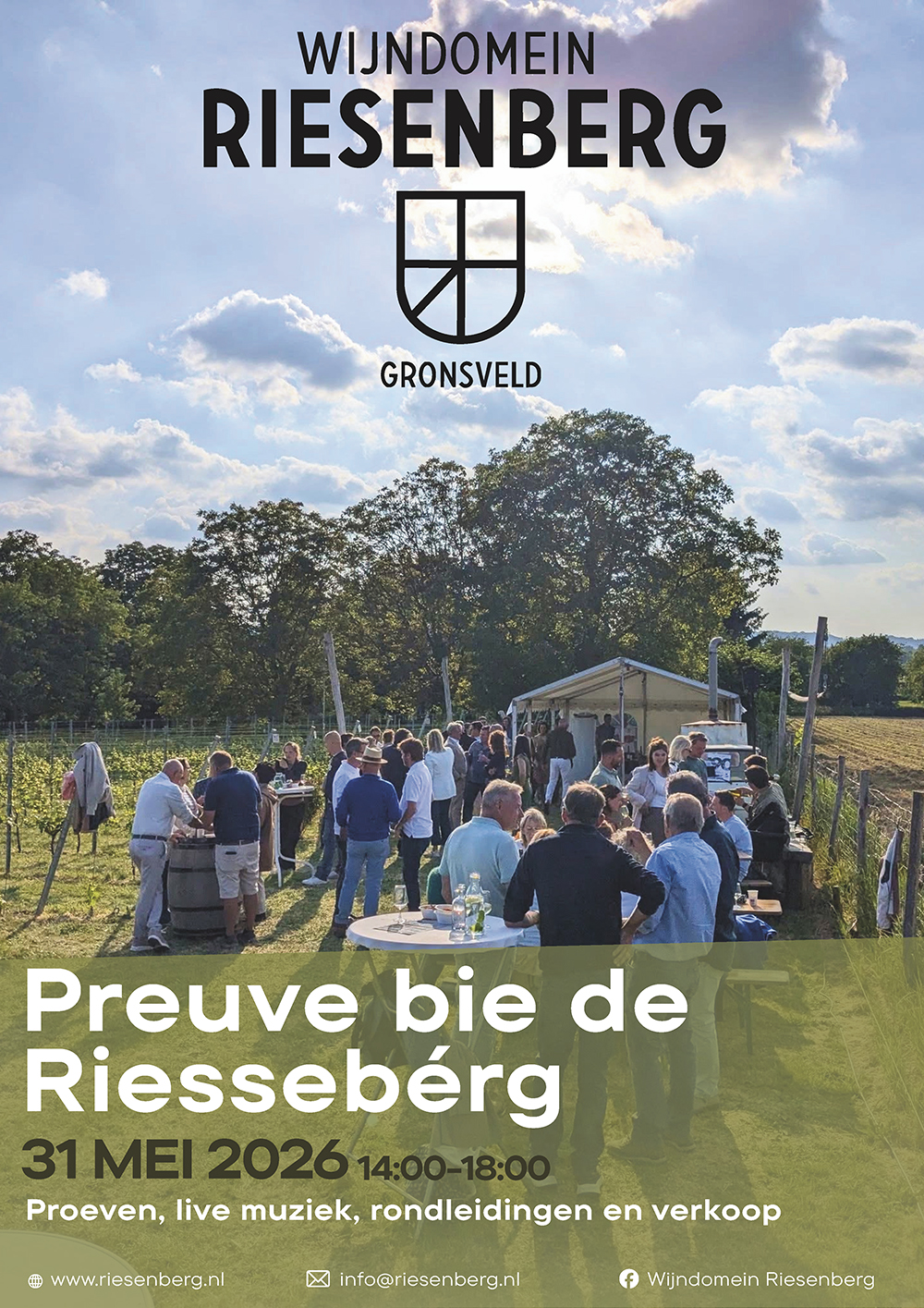 Na het verrassende succes van onze eerste editie vorig jaar, nodigen we je opnieuw van harte uit op Wijndomein Riesenberg in Gronsveld op zondag 31 mei van 14:00 tot 18:00 uur.